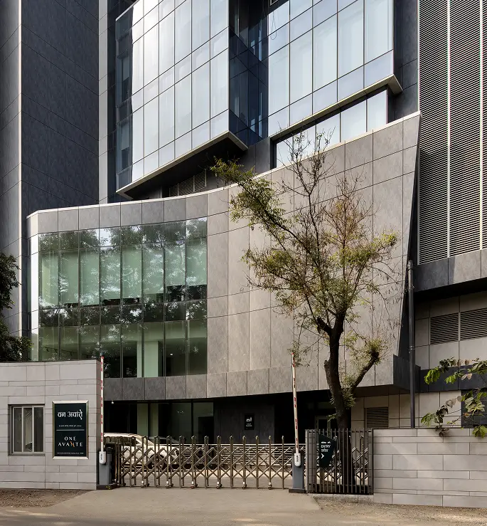 Strategic shading devices articulate the south and southwest façades, while natural stone and vitrified finishes add durability, texture, and visual depth. Stepped terraces further break down the scale of the 90+ meter built form, creating a dynamic architectural expression that balances strength with refinement.